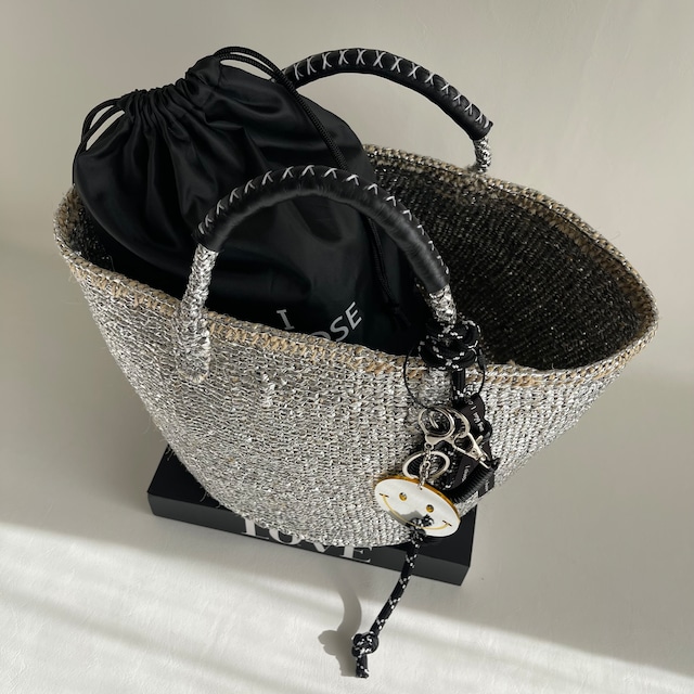 シルバーカラーの素材を編み込んだことで かごバッグが新しいスタイルになった ハイブリッドなコレクション こちらは、コロンとしたフォルムが可愛い MLサイズのカゴバッグ 丸底タイプでたっぷりの収納力も人気 今回のコレクションは、 スニーカーも入るサイズのナイロン巾着バッグと カラーが選べるスマイルチャーム付きです。 ・ブラックスマイル ・ミラースマイル ※着用画像にはチャームをアレンジしたものが含まれます。 イメージの参考にご覧ください。 個性と遊び心を大切にしたい大人のスタイル 流行を追わない 一期一会のかごバッグを長くお楽しみいただけますようにー。 そして、 このかごバッグには、 meong blueの思いも詰まっています。 ぜひ、下記を読み進めご覧ください。 ______________________________________ 環境に優しい天然素材とリサイクル素材から作られるシルバーカラーのカゴバッグ。 資源回収システムが整わないケニアでは、食品加工の製造過程で出るフィルム端材などが、そのまま野外に投棄されてしまうことがほとんど。 それならば、その端材をサイザルバッグに編み込み、地球環境を考えたサステナビリティな製品にしょう、という発想からシルバーカラーのサイザイルが誕生しました。 そして、その思いに賛同した meong blue では2018年より取扱いを開始。 端材の中でも文字などカラープリントが入らないシルバーを限定した製作をいち早くオリジナルにてオーダーし、今に至っています。 そのシルバーの色合いは、デイリーコーデにも合わせやすいグレーにツヤをまとったようや色合いなどその時の端材により生まれる「一期一会」が楽しいバッグになりました。 また、天然素材がベースのカゴバッグになりますので、バッグのサイズや質感にも個性があり唯一無二な製品になっています。 ※ハンドメイド製品は個人により感じ方が変わります。手づくりならではの個性とご理解のほどよろしくお願いいたします。 どうぞ、手仕事の温もりを感じて頂けますように。 ________________________________________ 海外と日本の手仕事が素敵にコラボしたレザーコンビバッグ。 アフリカに住む女性の手仕事からつくられるサイザル麻の製品は丈夫で10年使えると言われています。 そんな丈夫なバッグにmeong blueオリジナルのモチーフを付け、遊び心あるデザインバッグに。 革のハンドルは手にフィットしやすいシュリンクレザーを使用、重たいモノを入れても持ちやすく機能的! 隙間なく革を付けているので、革だけズレてしまうこともありません。 ハンドル加工、革のモチーフなどひとつひとつmeong blue国内工房で手作業で丁寧に仕上げられ、大量生産では決して出来ない繊細な仕上がりを感じていただけます。 カジュアルだけど妥協しない、そんな@meong_satokoの欲張りな思いが詰まった特別なバッグです。 ____________________________________ [ 発送について ] 1月29日より発送発送 [ 素材 ] サイザル 牛革(シュリンクレザー) [ カラー ] バッグ本体 = シルバー ハンドル = ブラック [ サイズ/センチ ] 約W95~110(口周)xH20x30(マチ)x28(ハンドル) ※天然素材のハンドメイド品のため、色合い、形、サイズに多少のバラつきがあります。 ----------------------------------------------------------------- { ご注意とお願い } 海外商品は日本の検品基準と異なる為、一見、不良品かと思われるような物もございますが海外では良品扱いになる場合がございます。特にハンドメイド製品には個体差もあります。 当店では製作者・メーカーの品質出荷基準に基づきご使用に問題のない範囲の商品を販売させて頂いておりますので、ご理解の上ご購入のご検討をお願いいたします。 サイザルバッグは天然素材を使用しておりますので、実物は個人により感じ方が変わります。手づくりならではの個性とご理解のほどよろしくお願いいたします。 どうぞ、手仕事の温もりを感じて頂けますように。