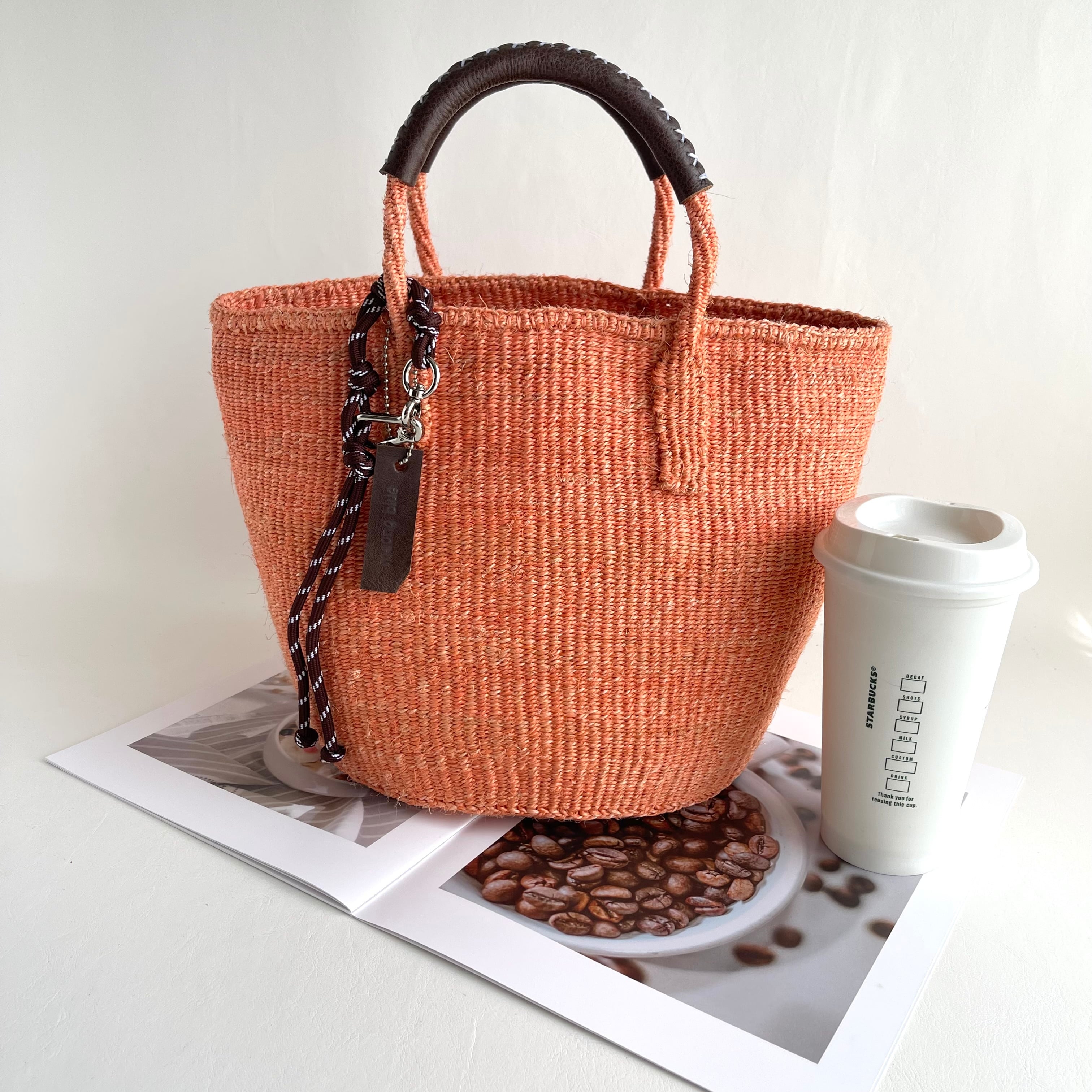 サイザルバッグは天然素材を使用しておりますので、実物は個人により感じ方が変わります。手づくりならではの個性とご理解のほどよろしくお願いいたします。