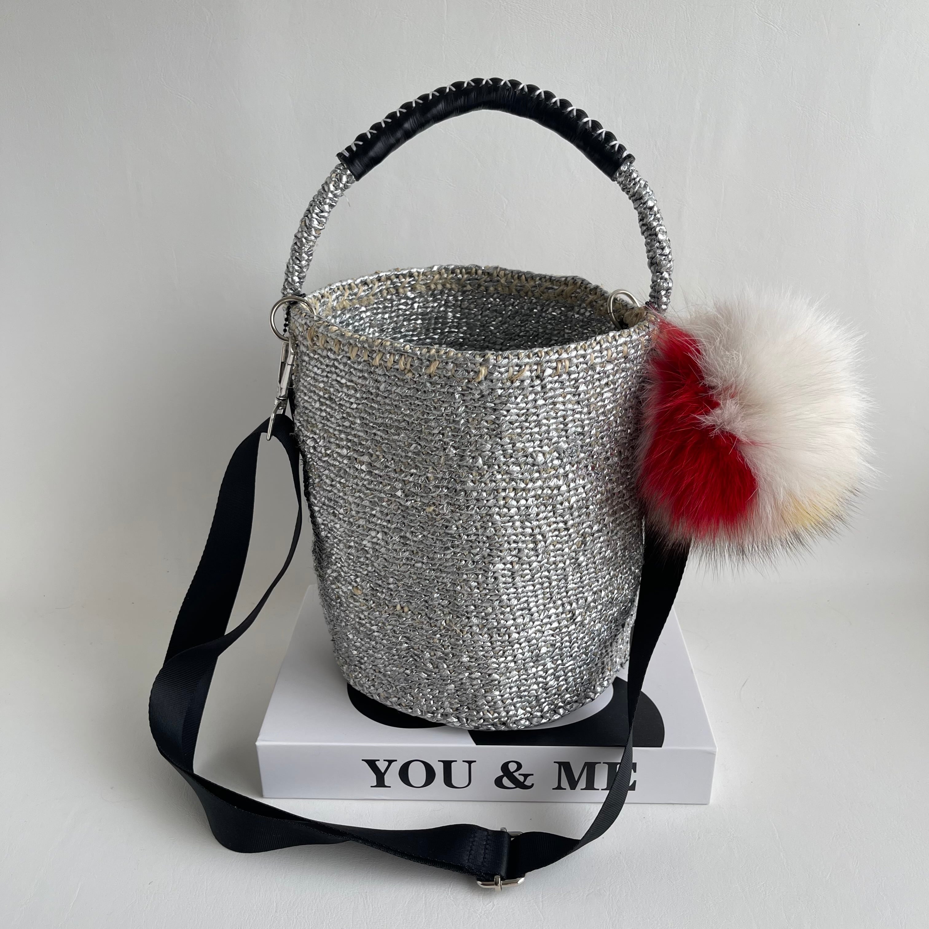 環境に優しい天然素材とリサイクル素材から作られるシルバーカラーのカゴバッグ。