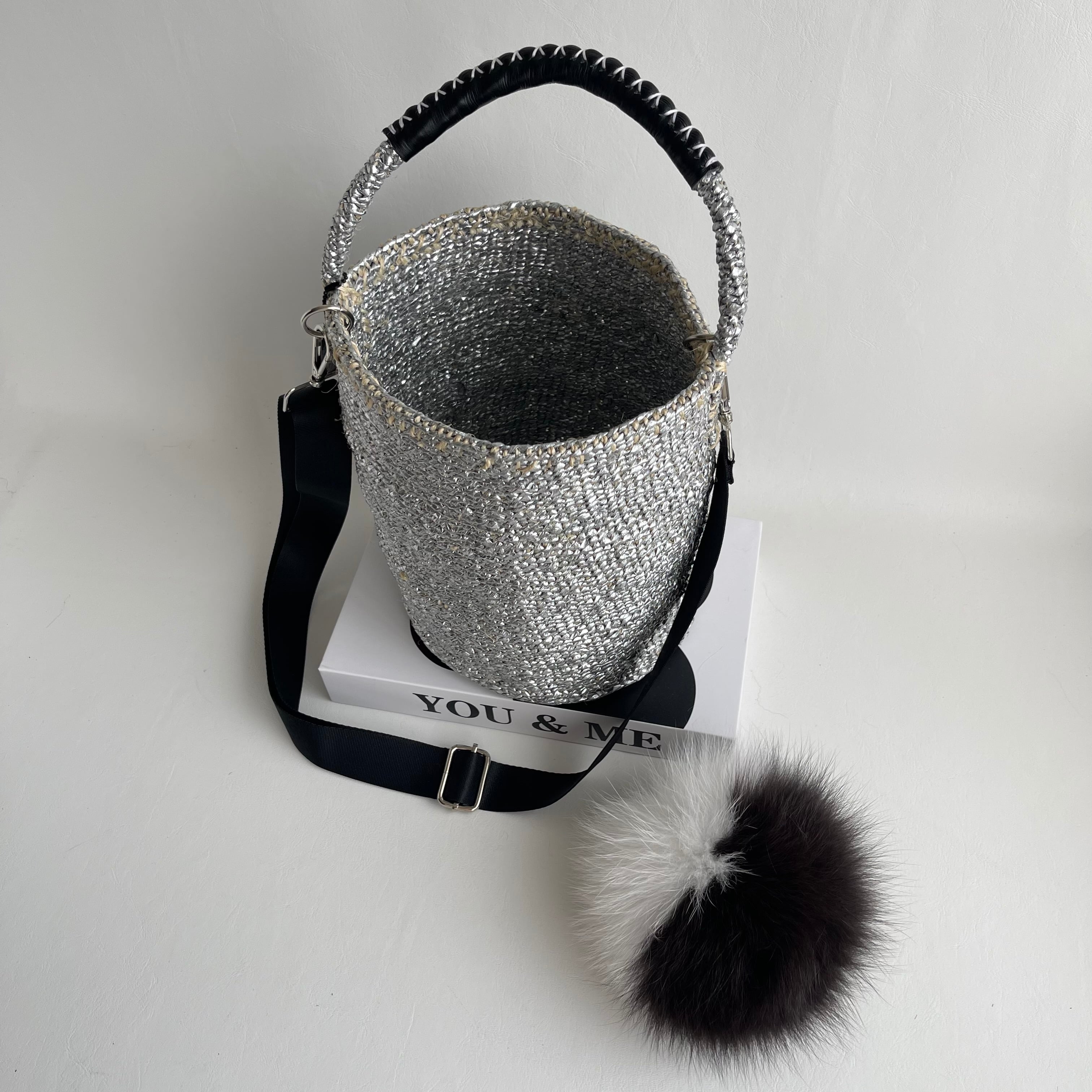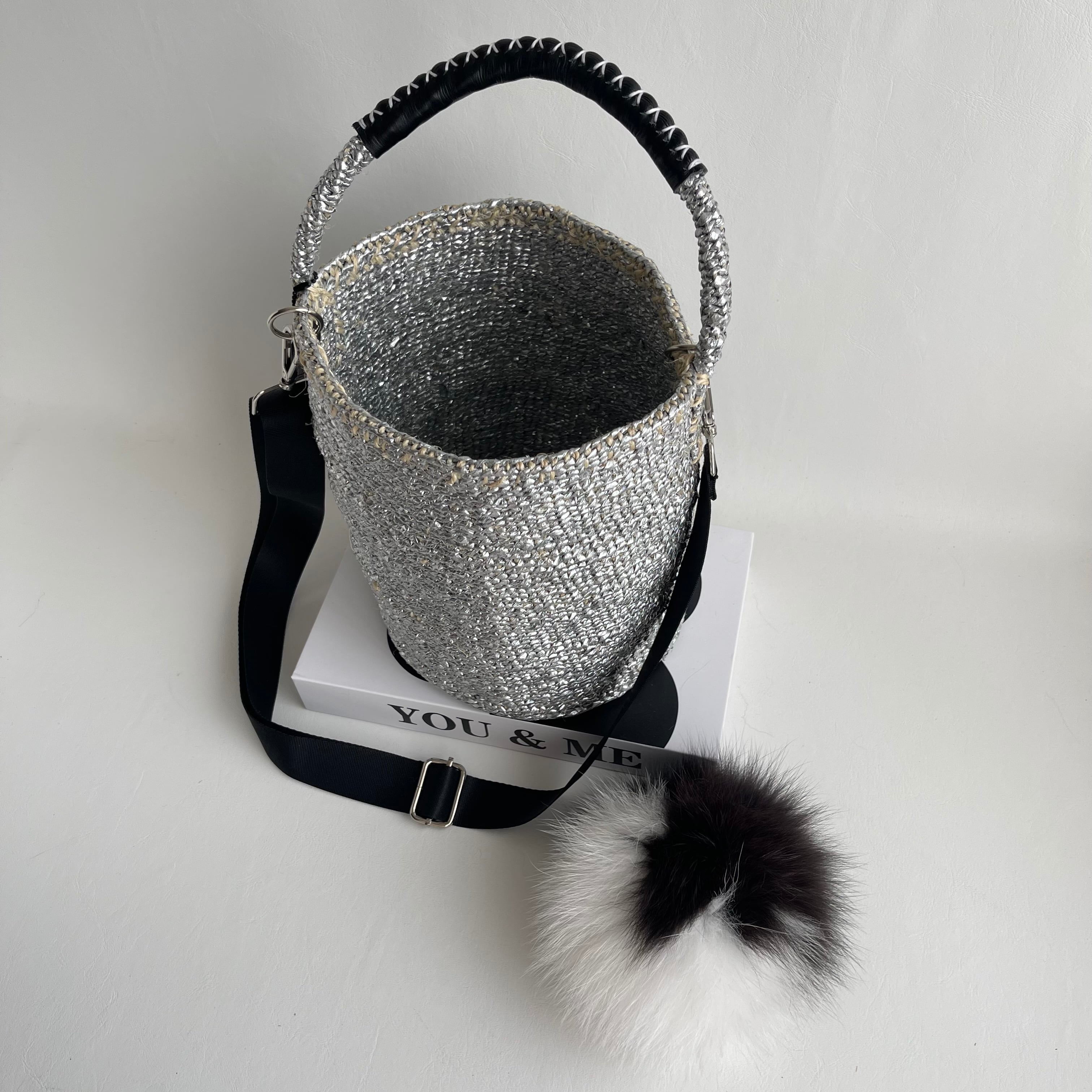 環境に優しい天然素材とリサイクル素材から作られるシルバーカラーのカゴバッグ。