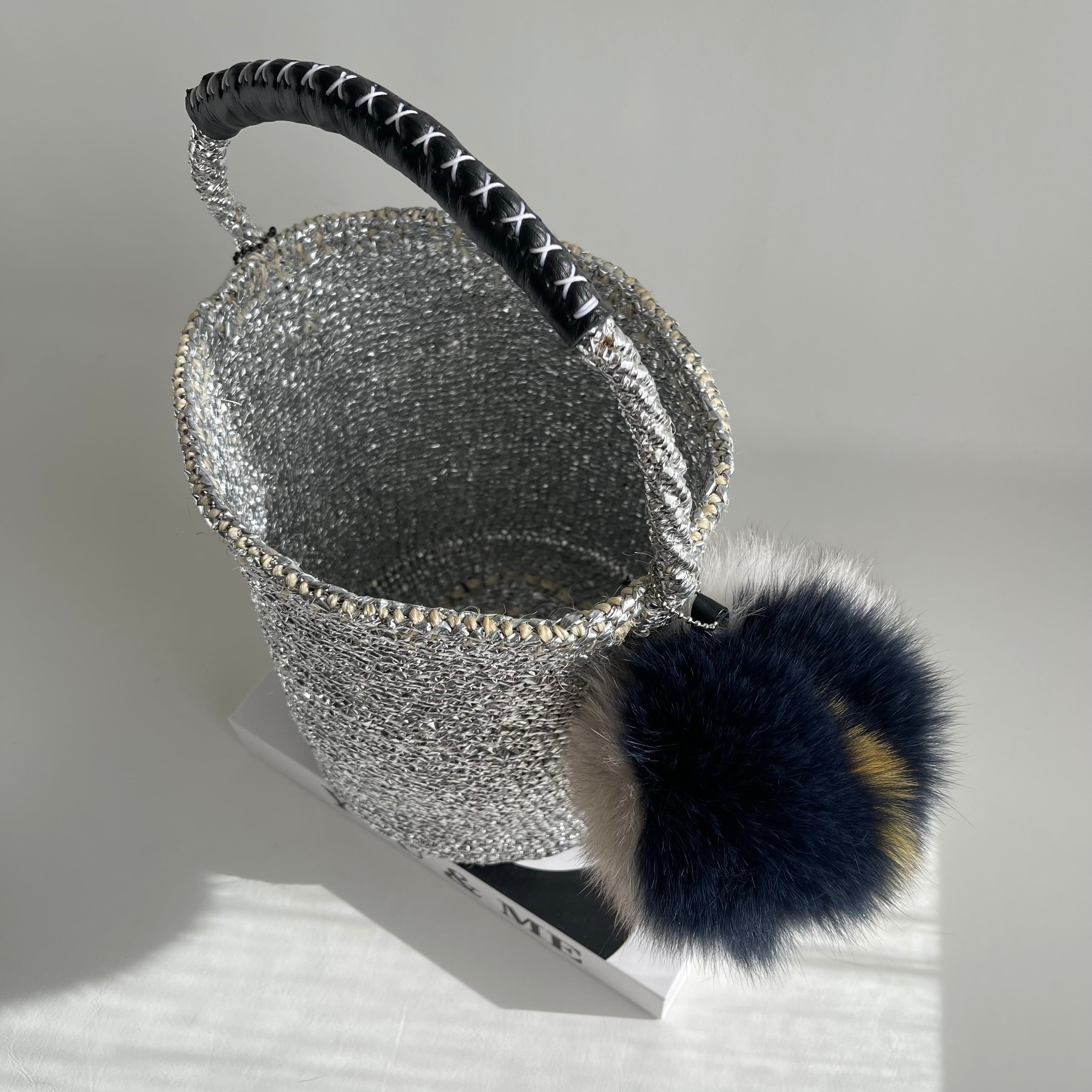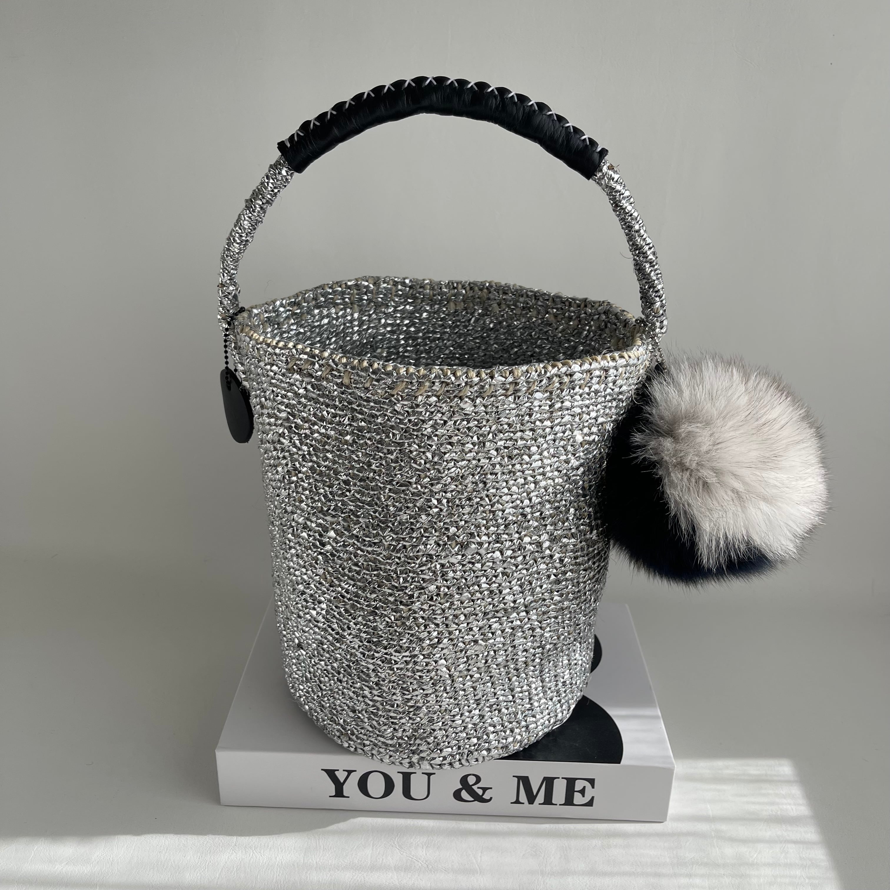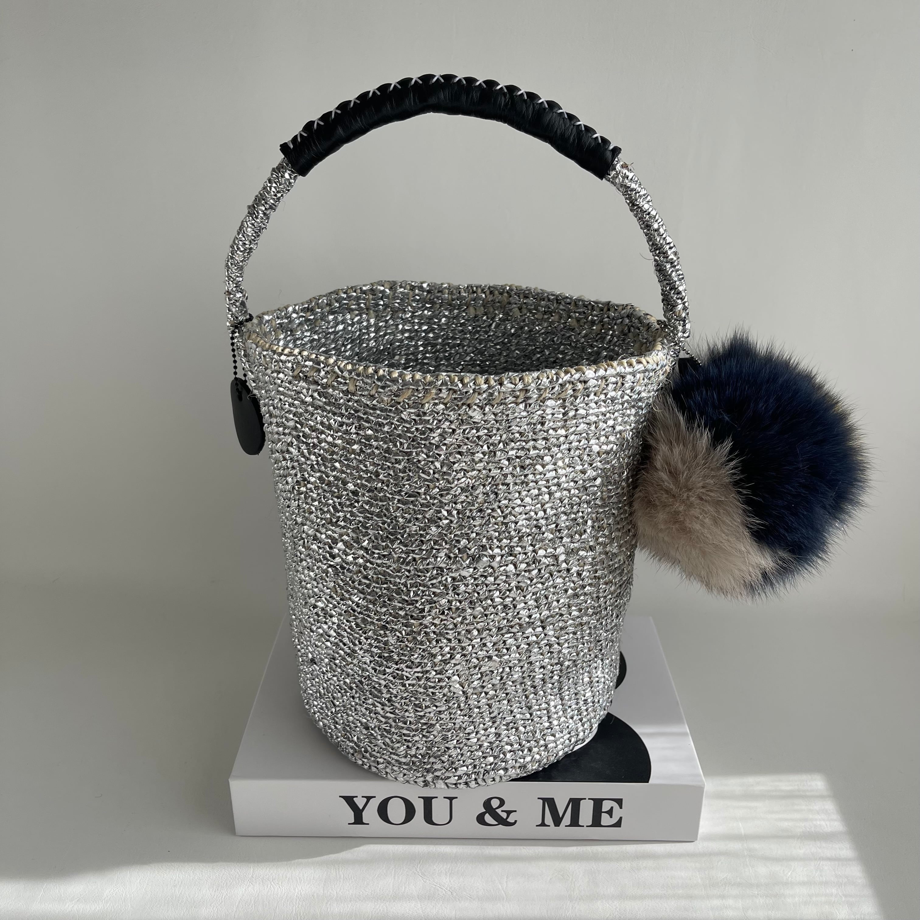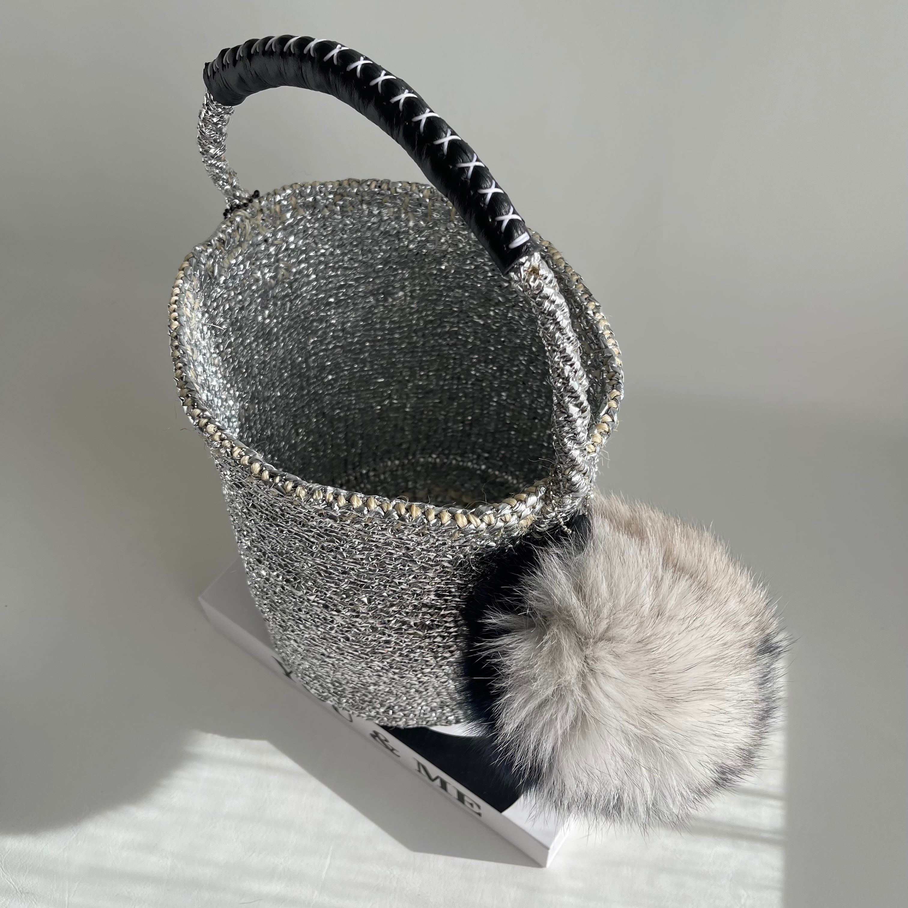 環境に優しい天然素材とリサイクル素材から作られるシルバーカラーのカゴバッグ。