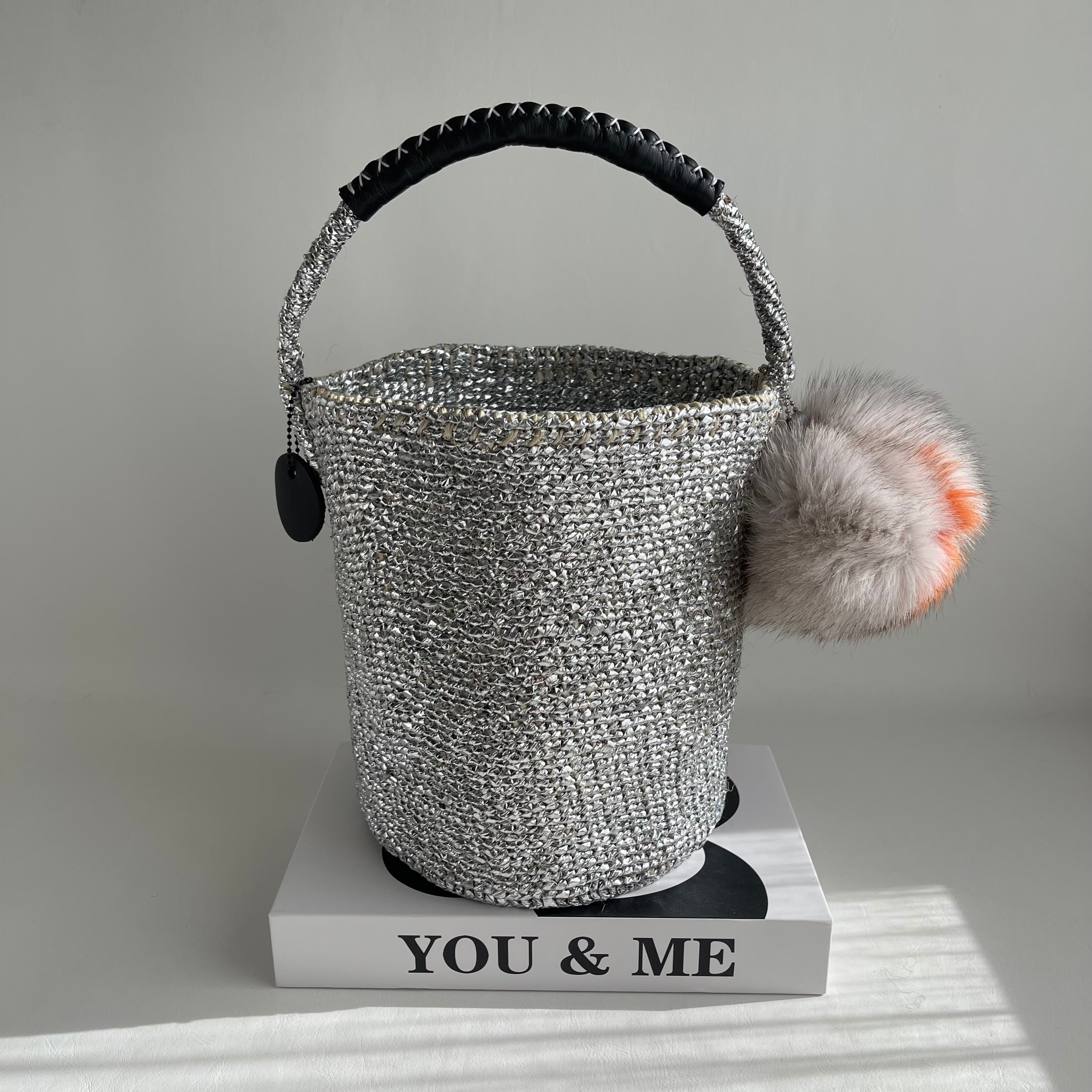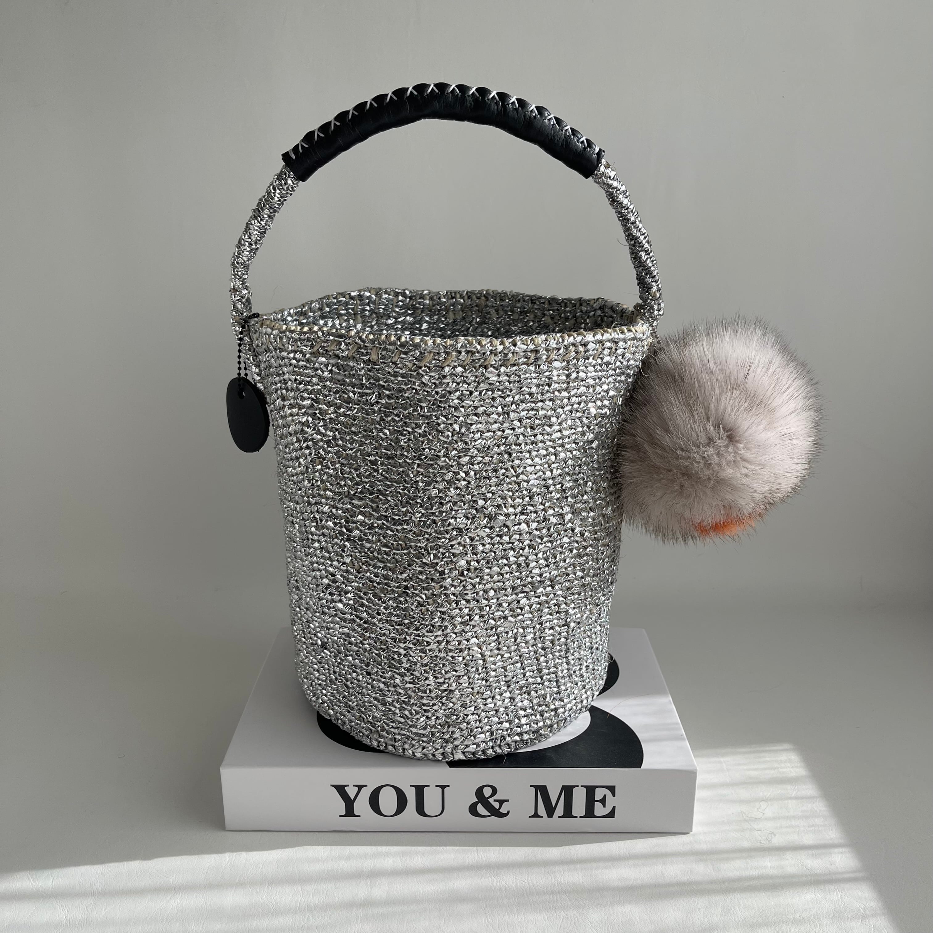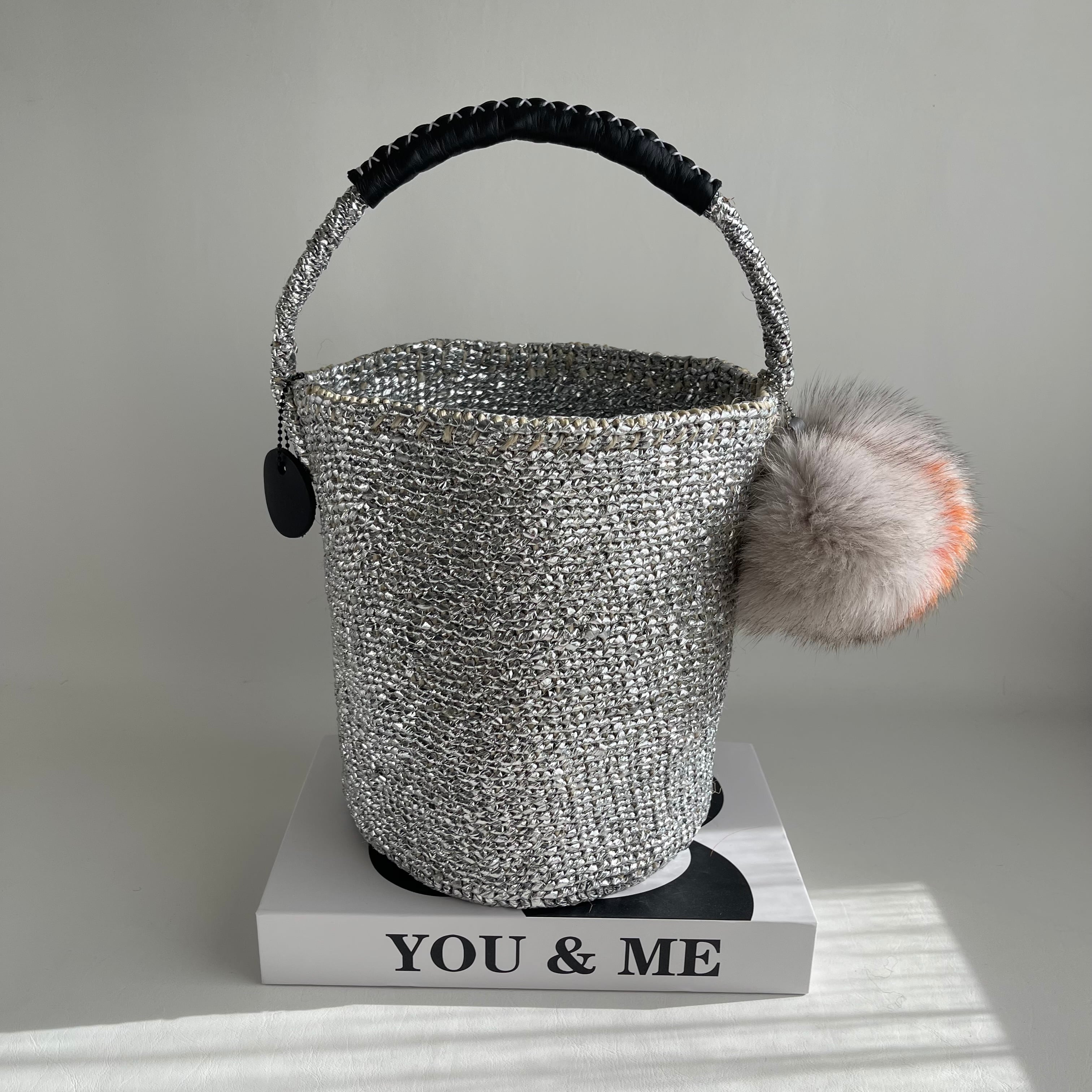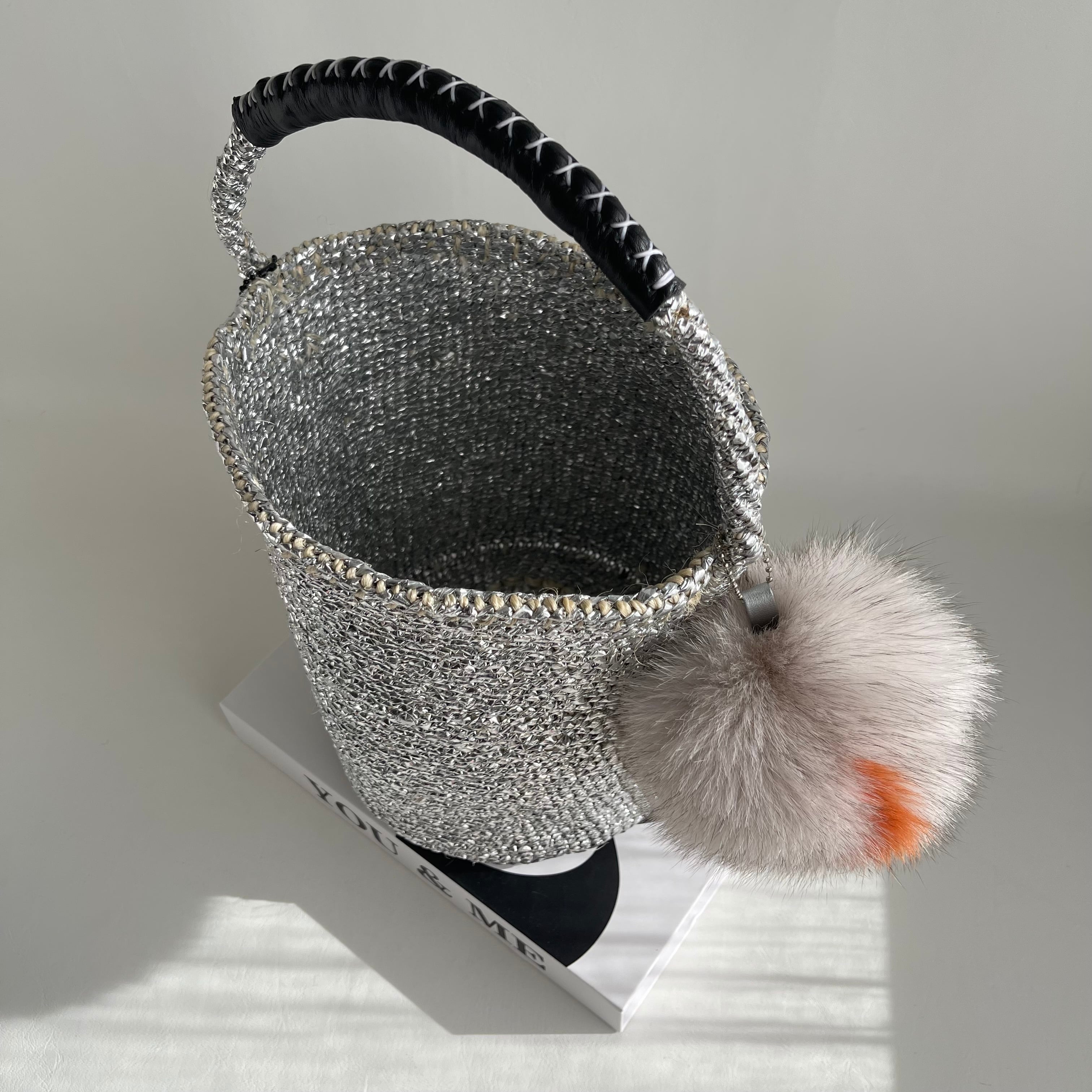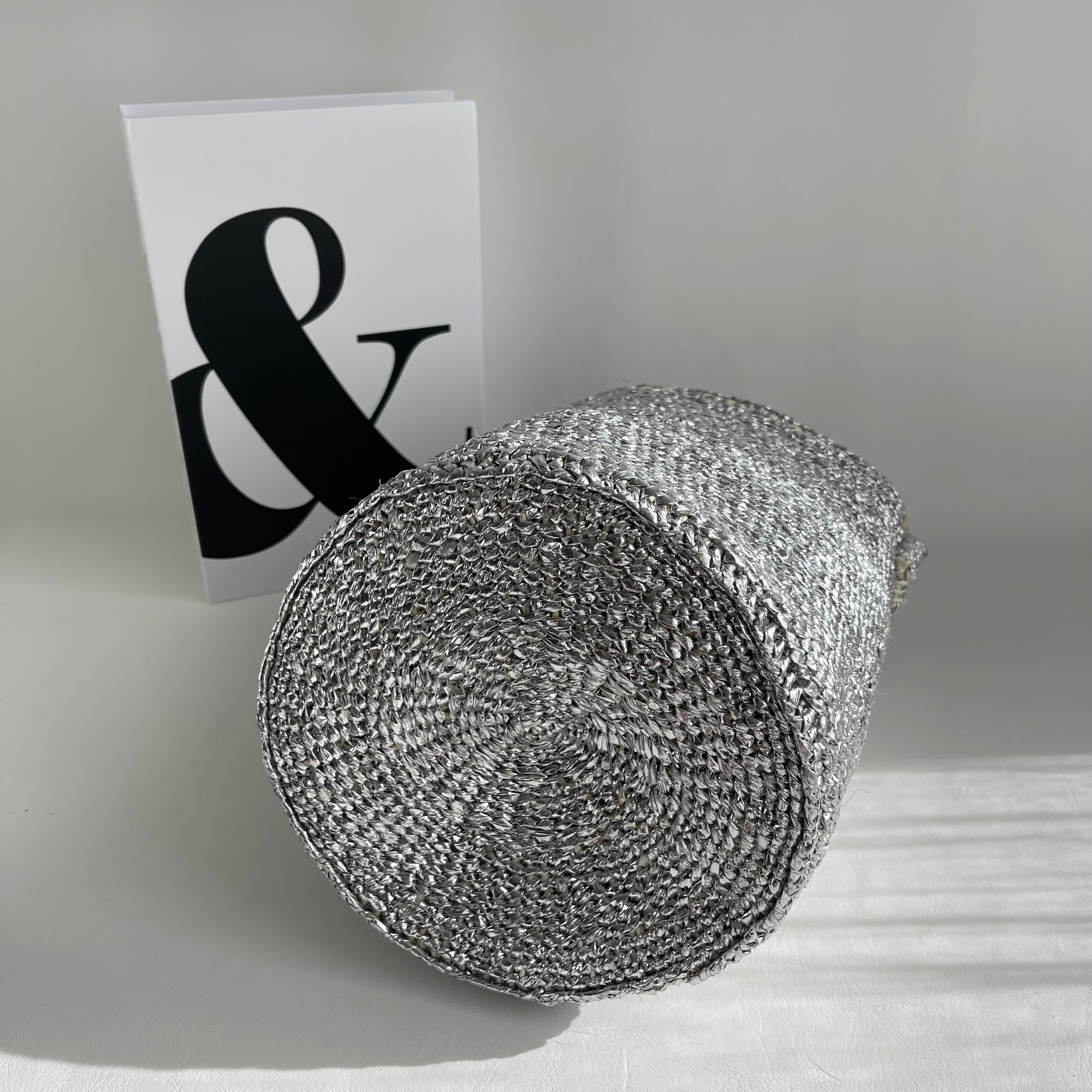 環境に優しい天然素材とリサイクル素材から作られるシルバーカラーのカゴバッグ。