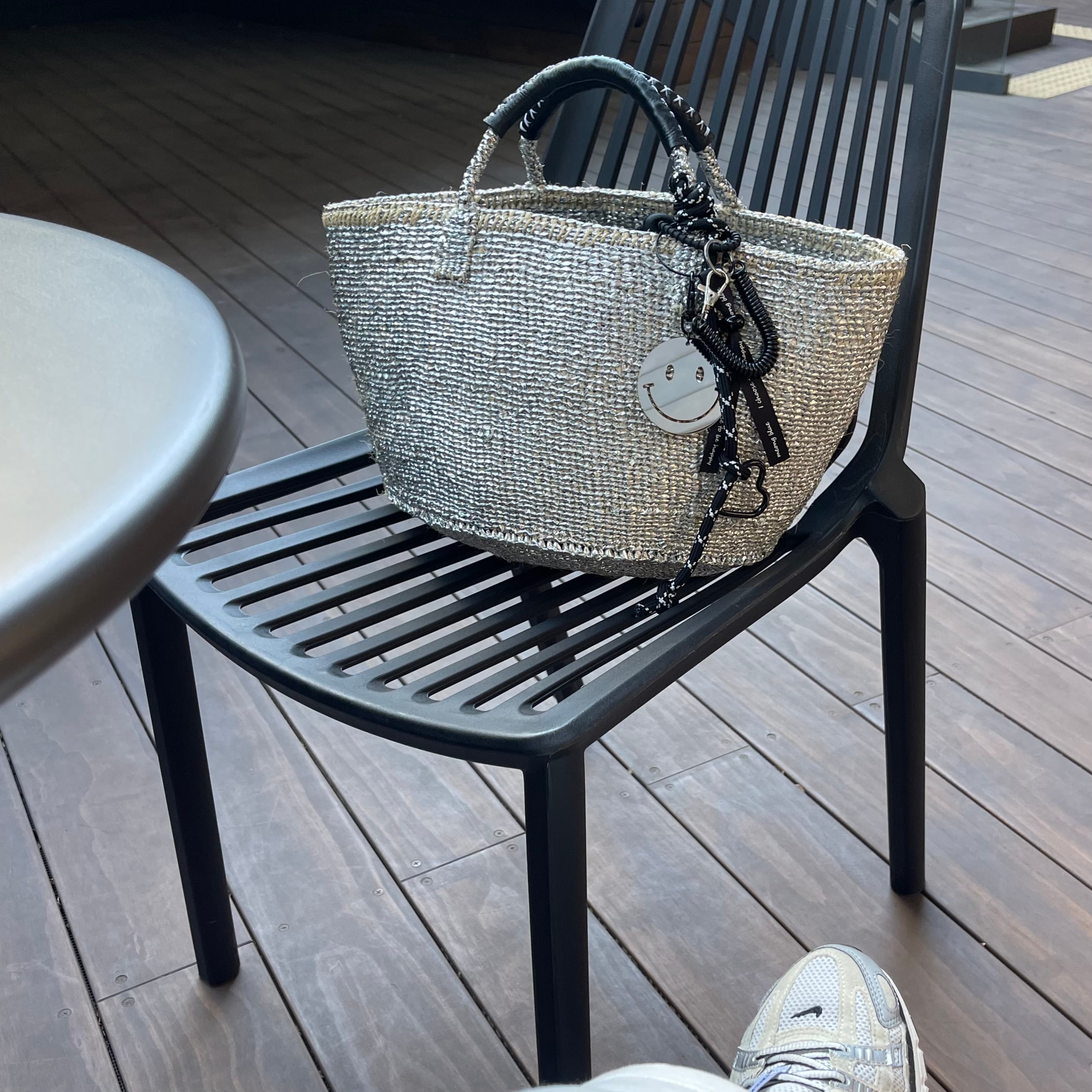 環境に優しい天然素材とリサイクル素材から作られるシルバーカラーのカゴバッグ。