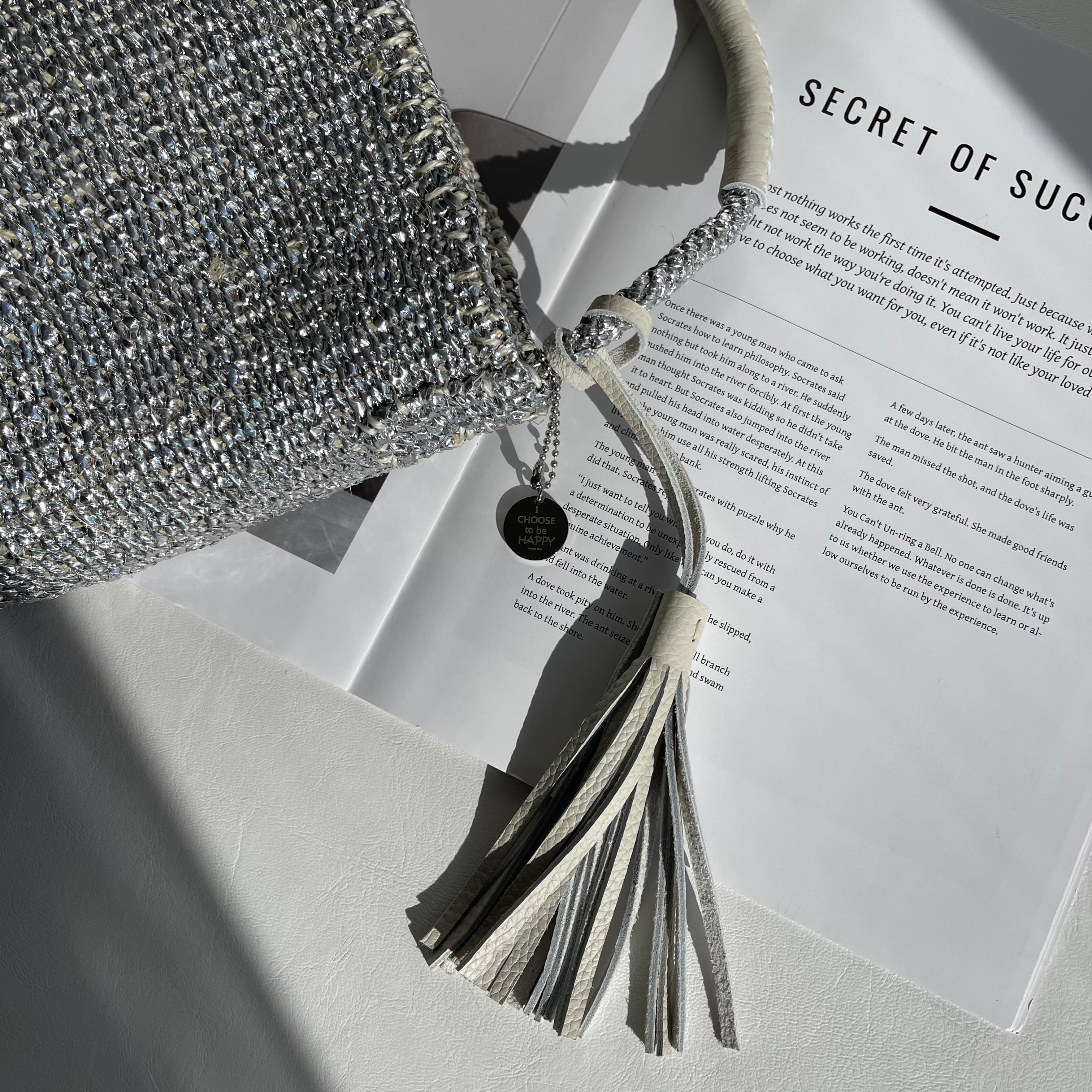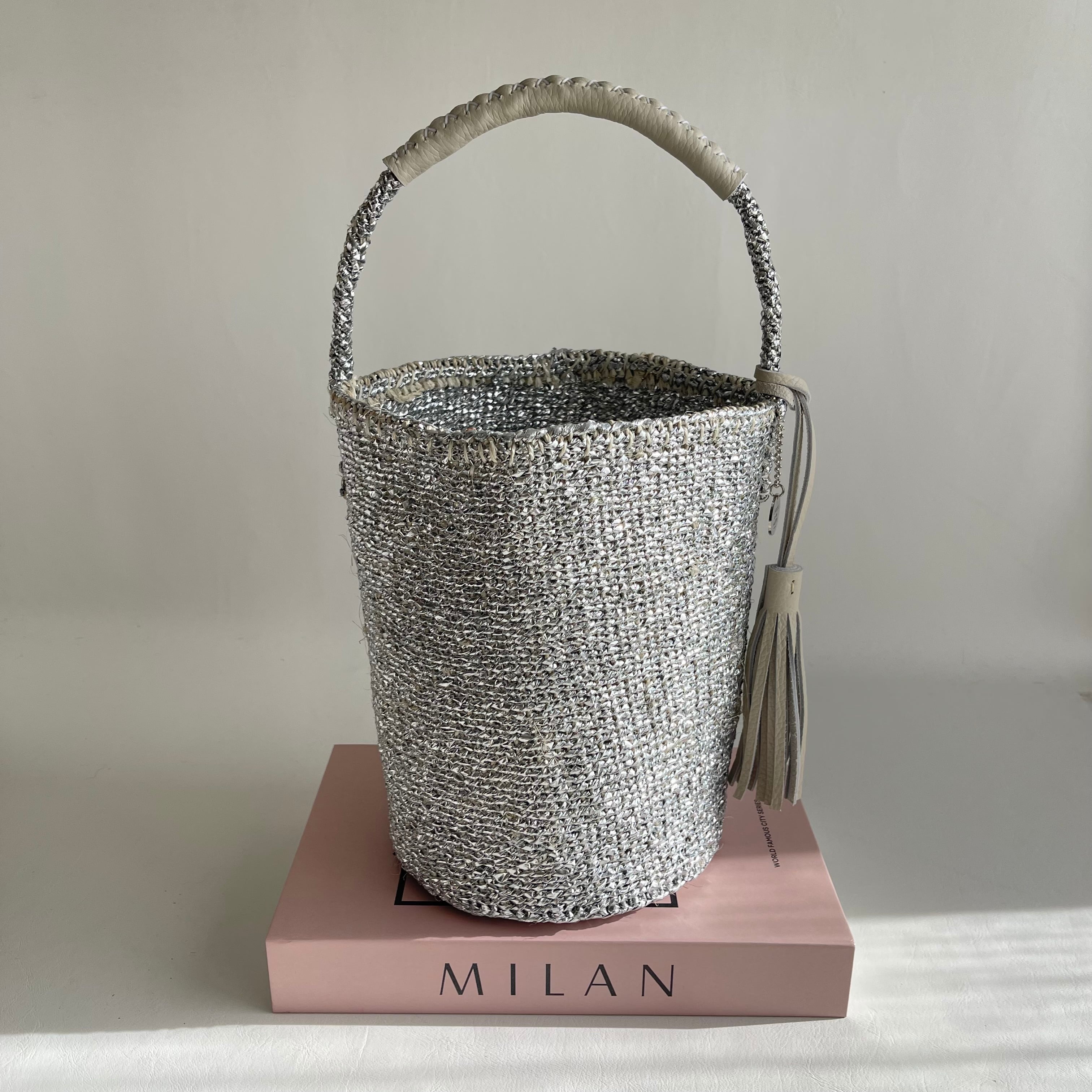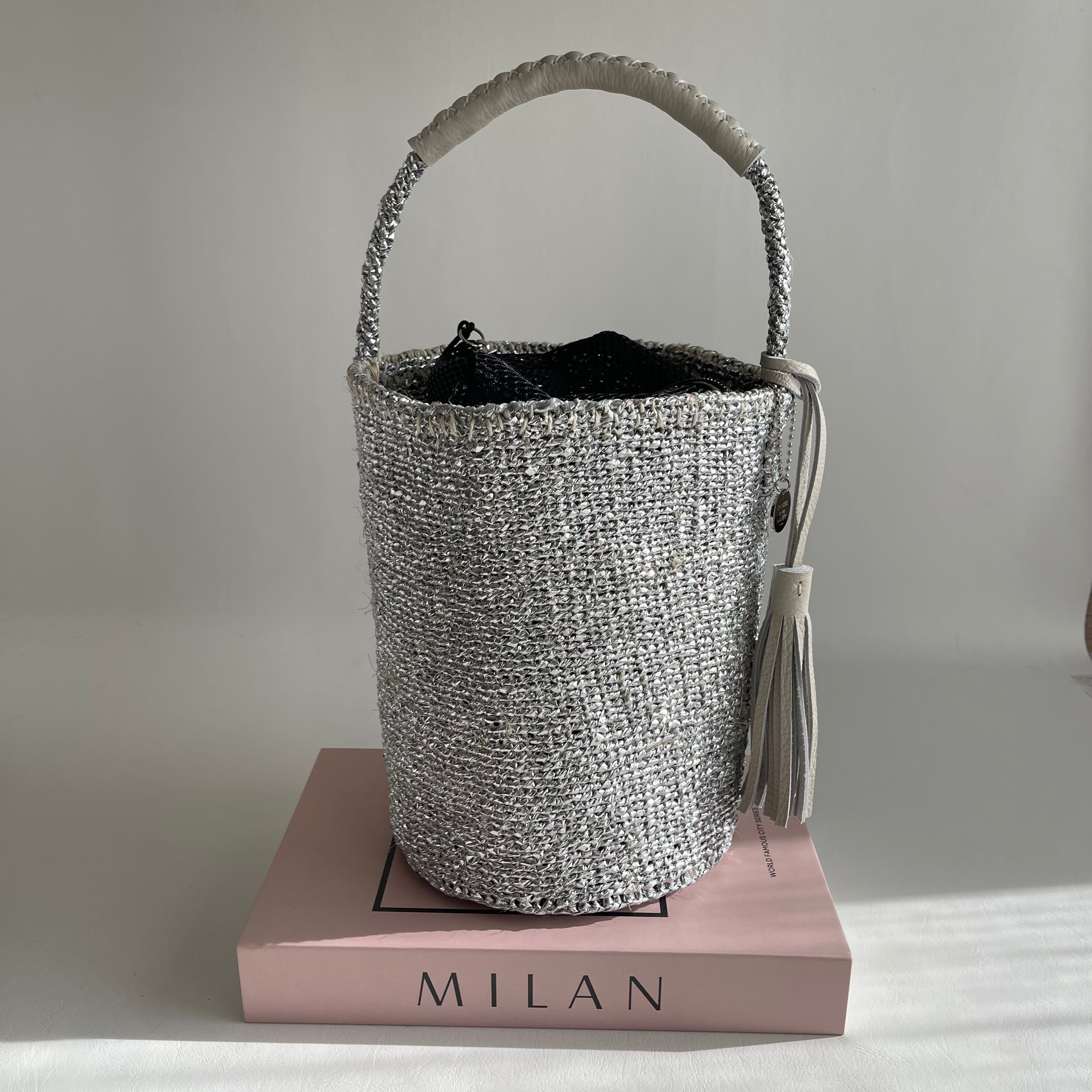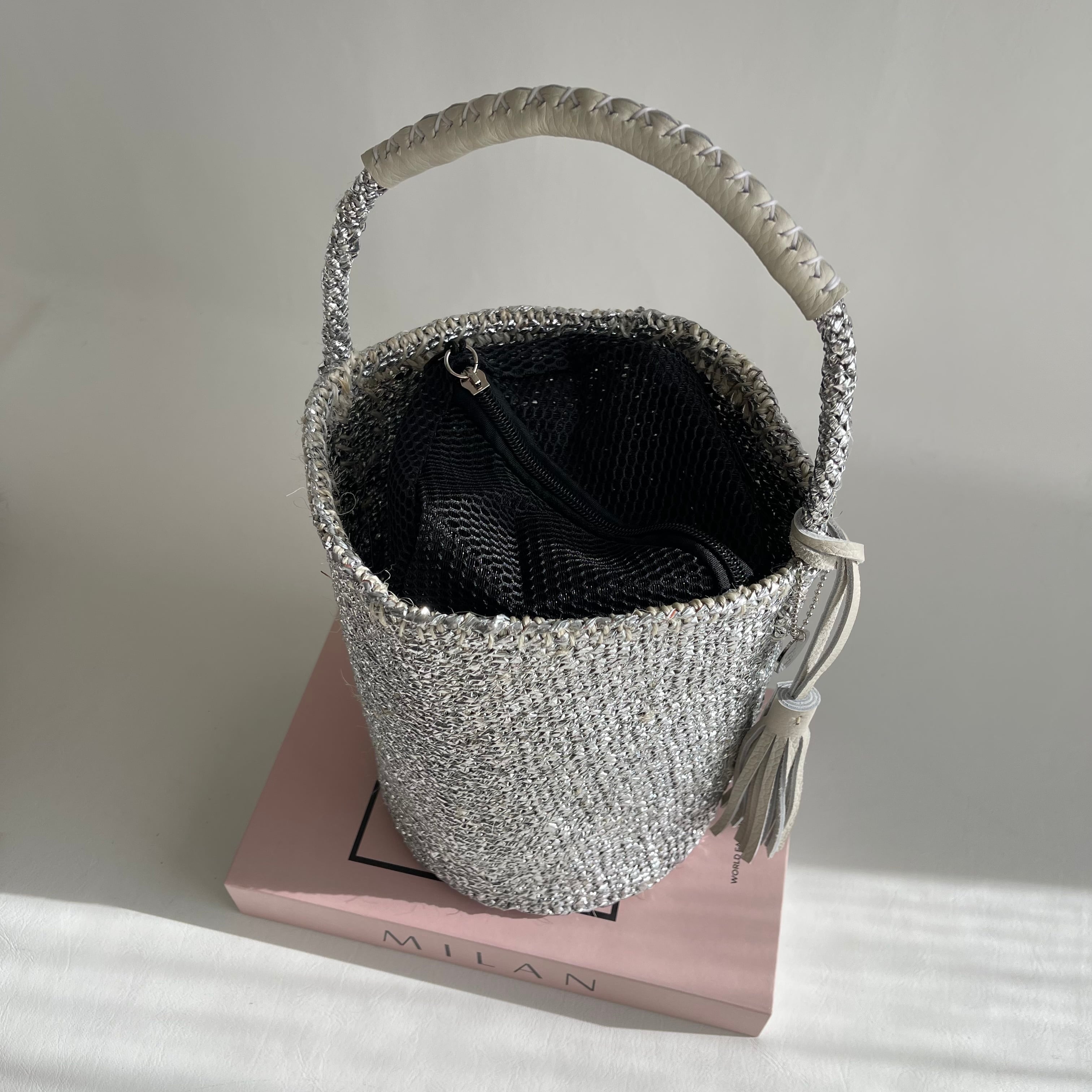 環境に優しい天然素材とリサイクル素材から作られるシルバーカラーのカゴバッグ。
