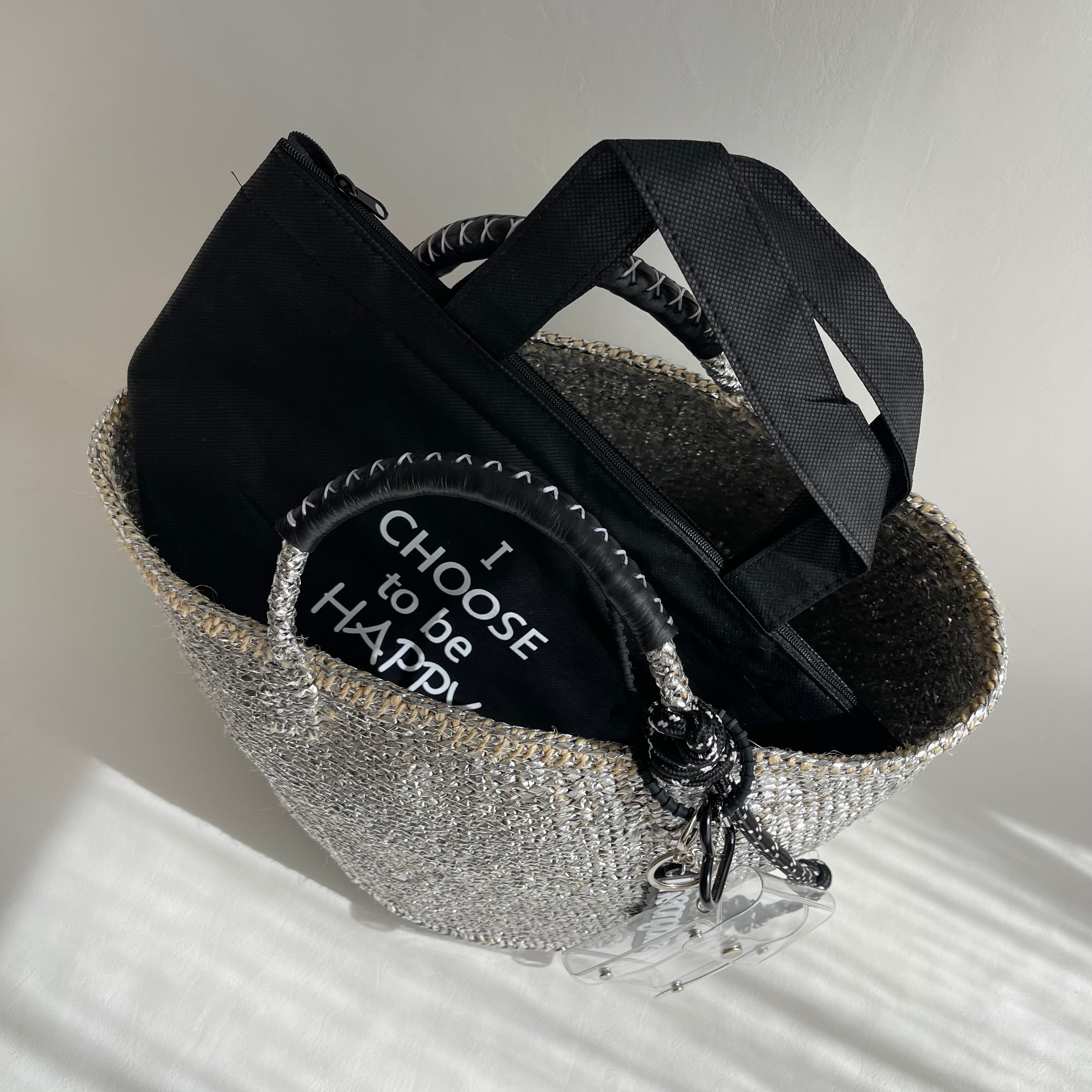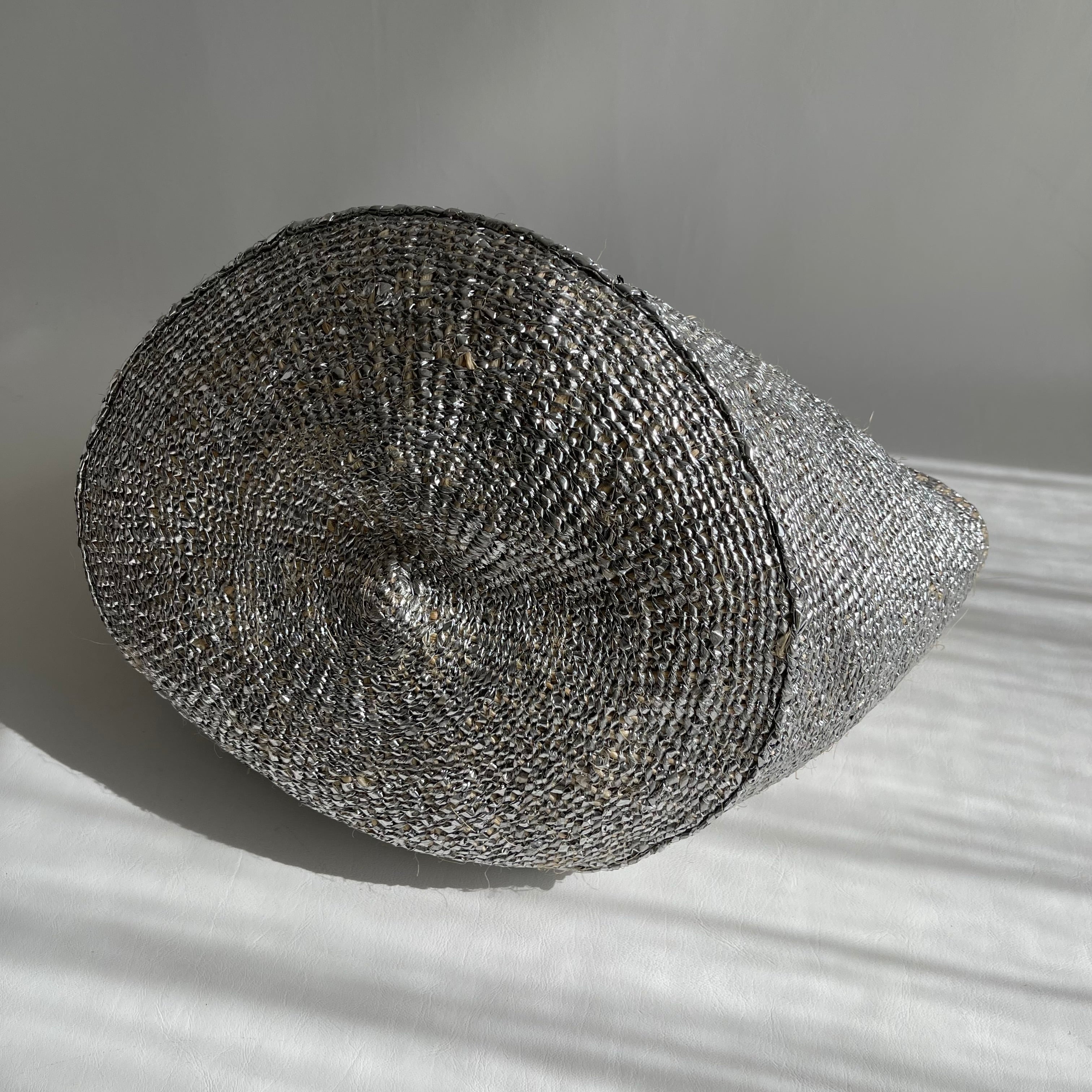環境に優しい天然素材とリサイクル素材から作られるシルバーカラーのカゴバッグ。