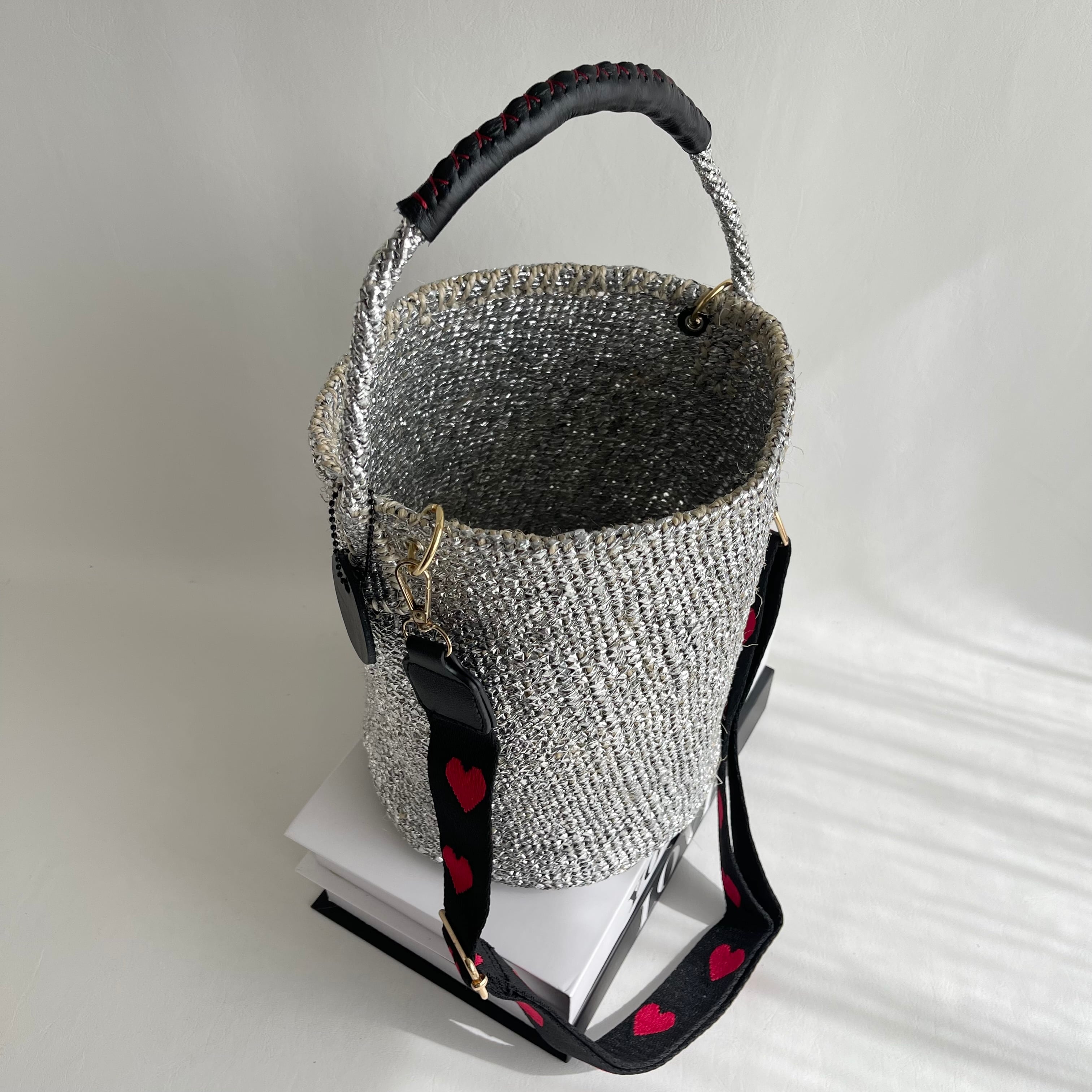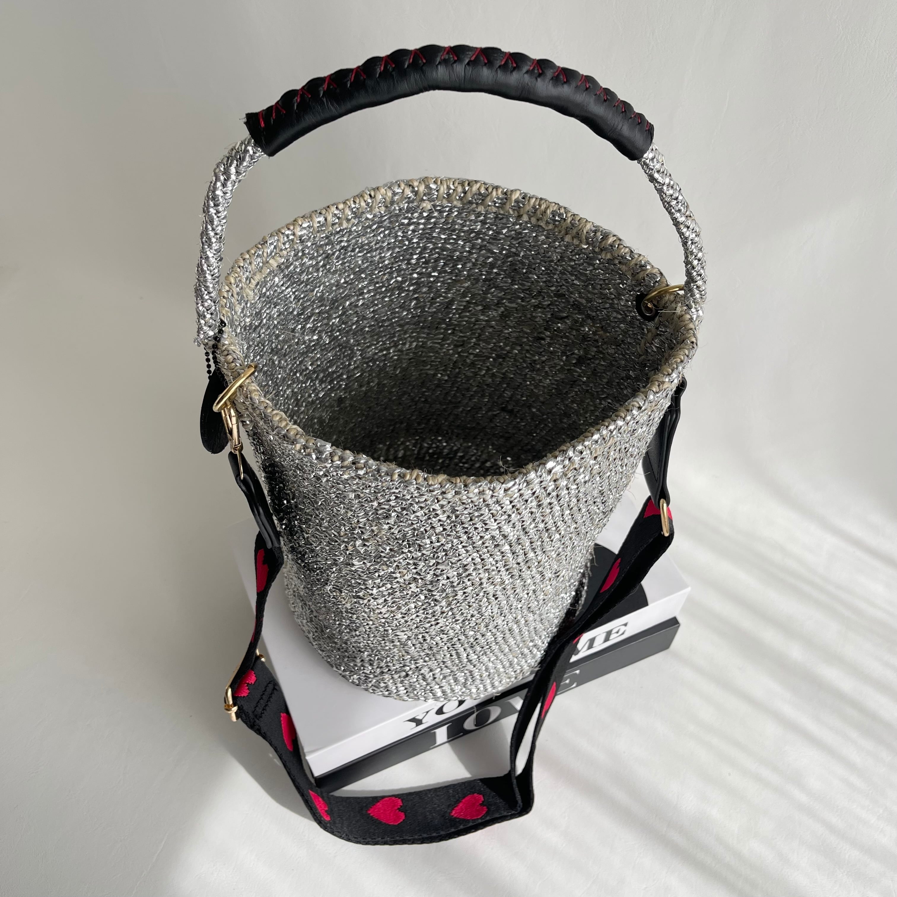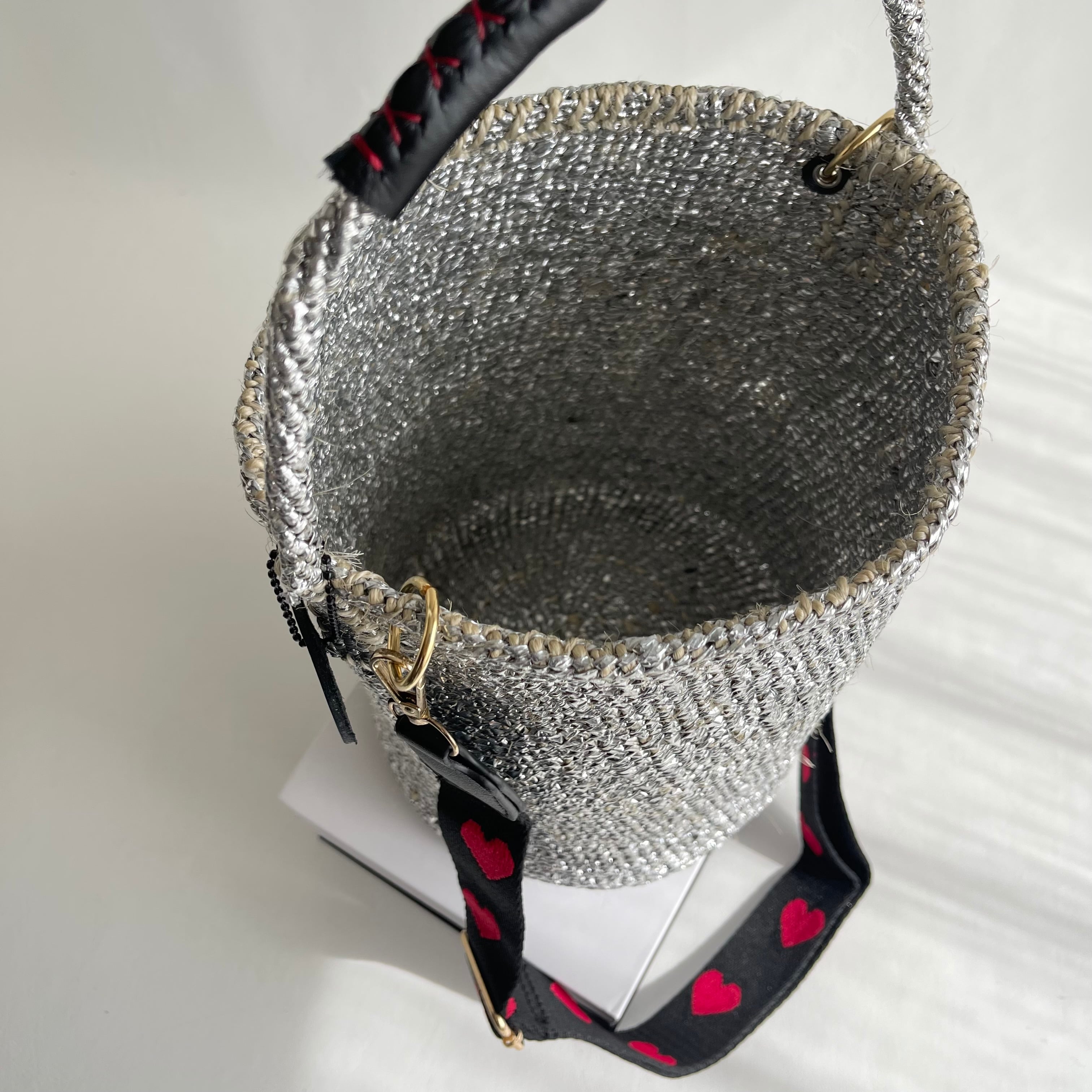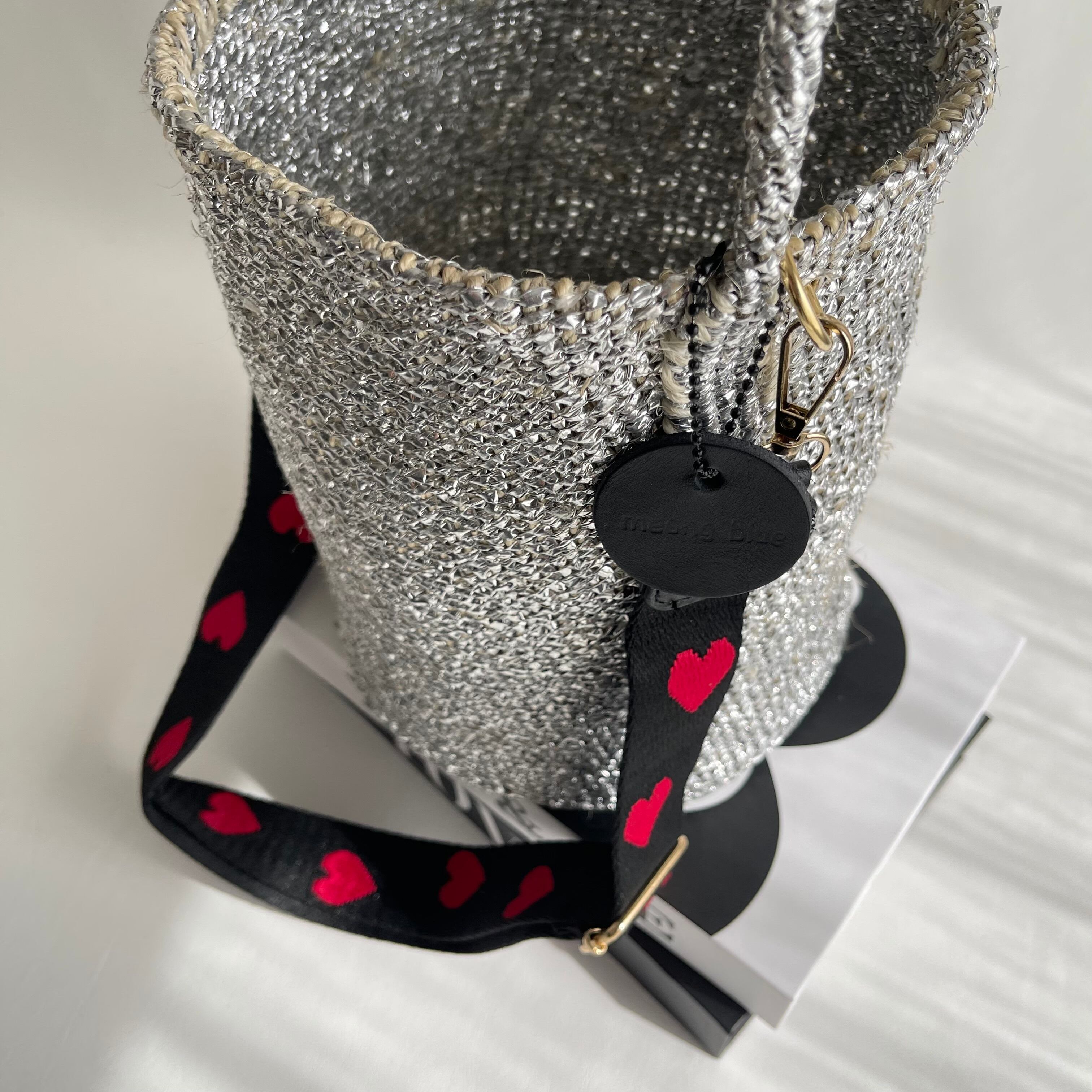 環境に優しい天然素材とリサイクル素材から作られるシルバーカラーのカゴバッグ。