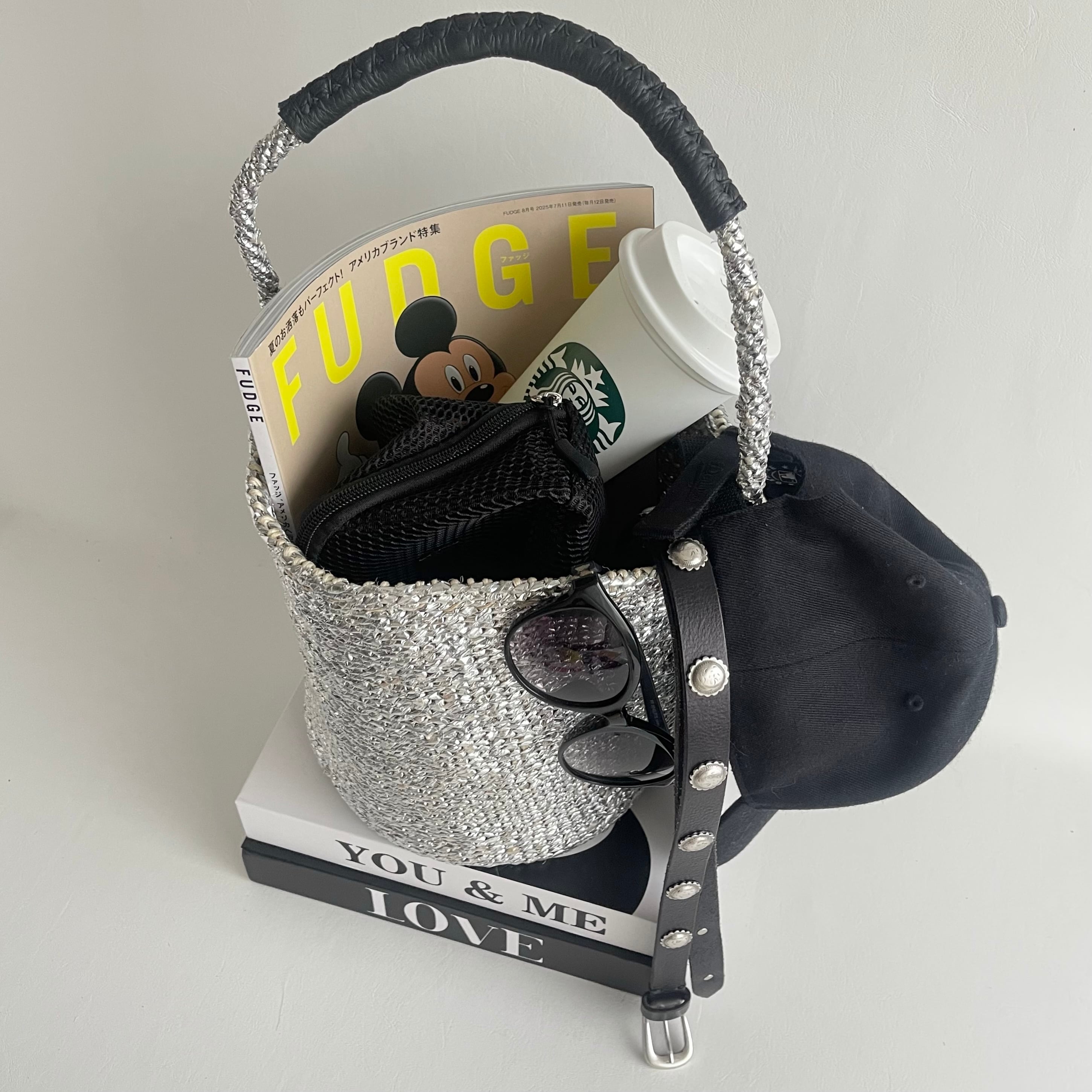 環境に優しい天然素材とリサイクル素材から作られるシルバーカラーのカゴバッグ。