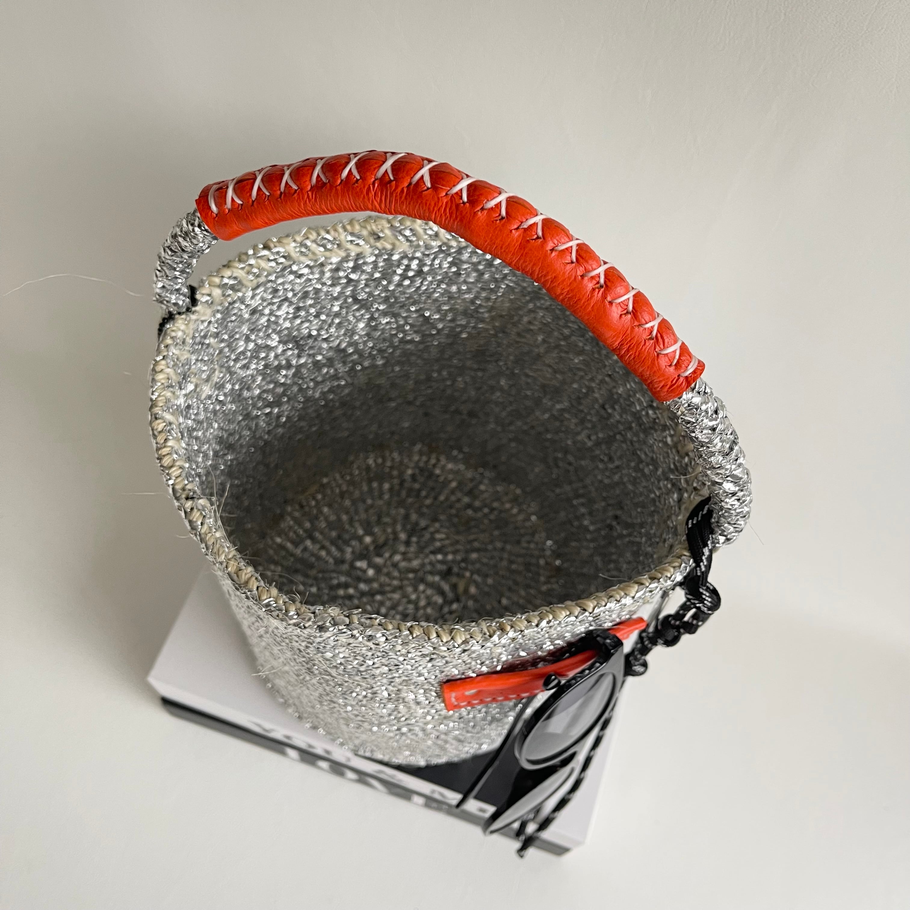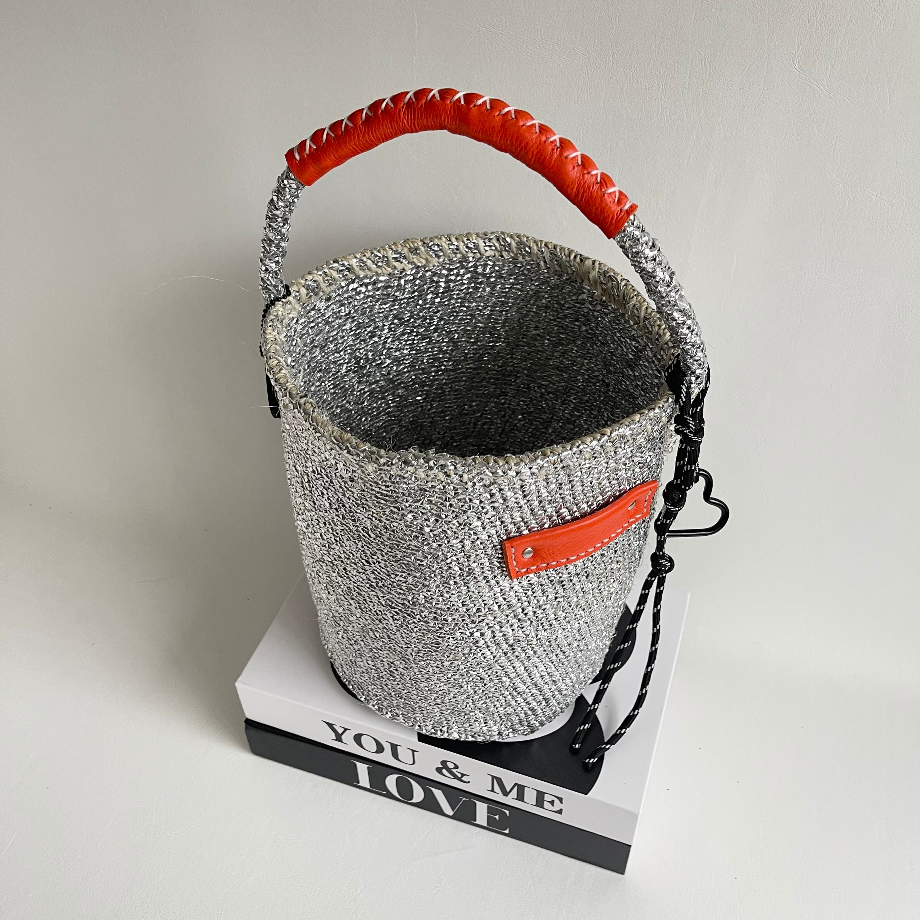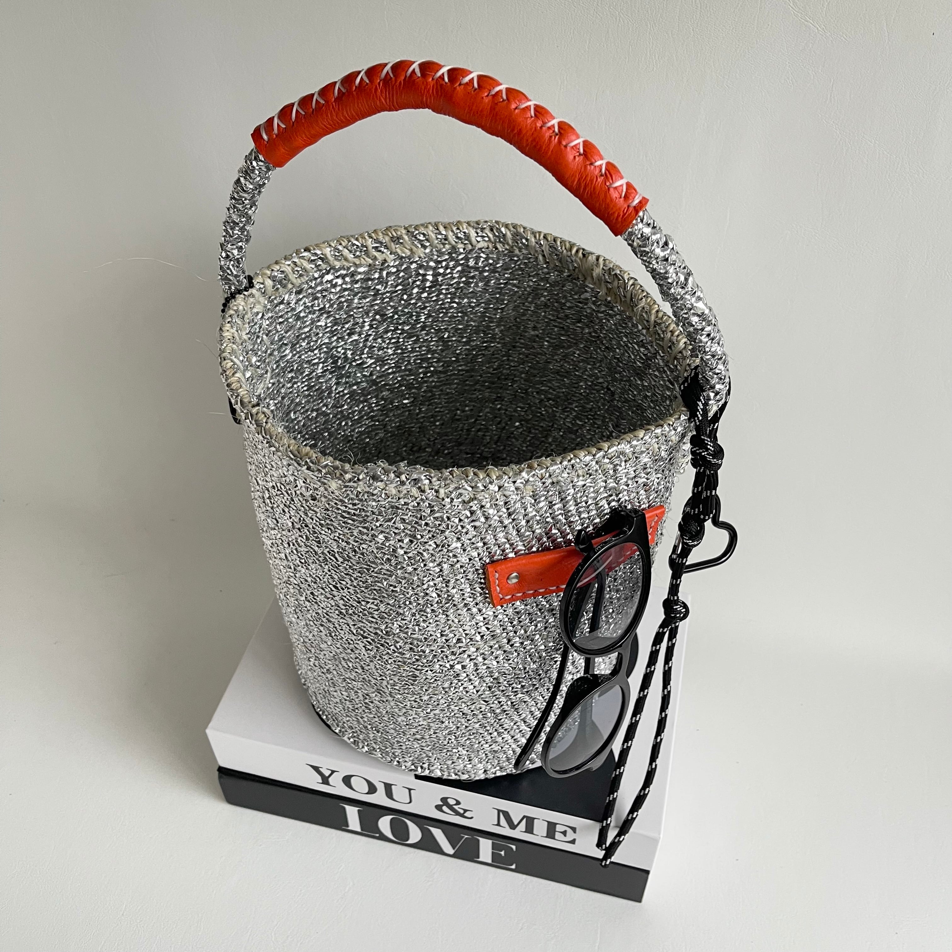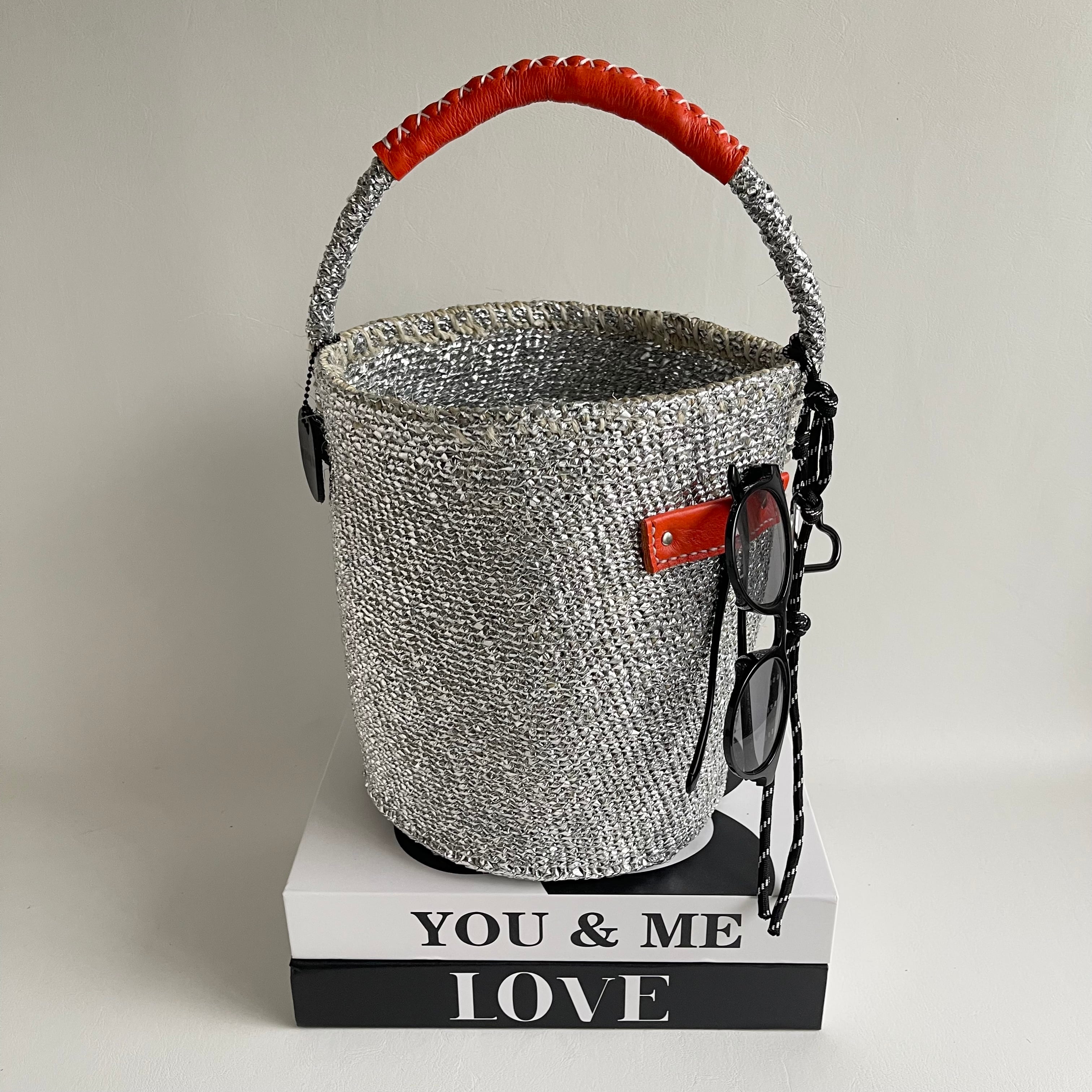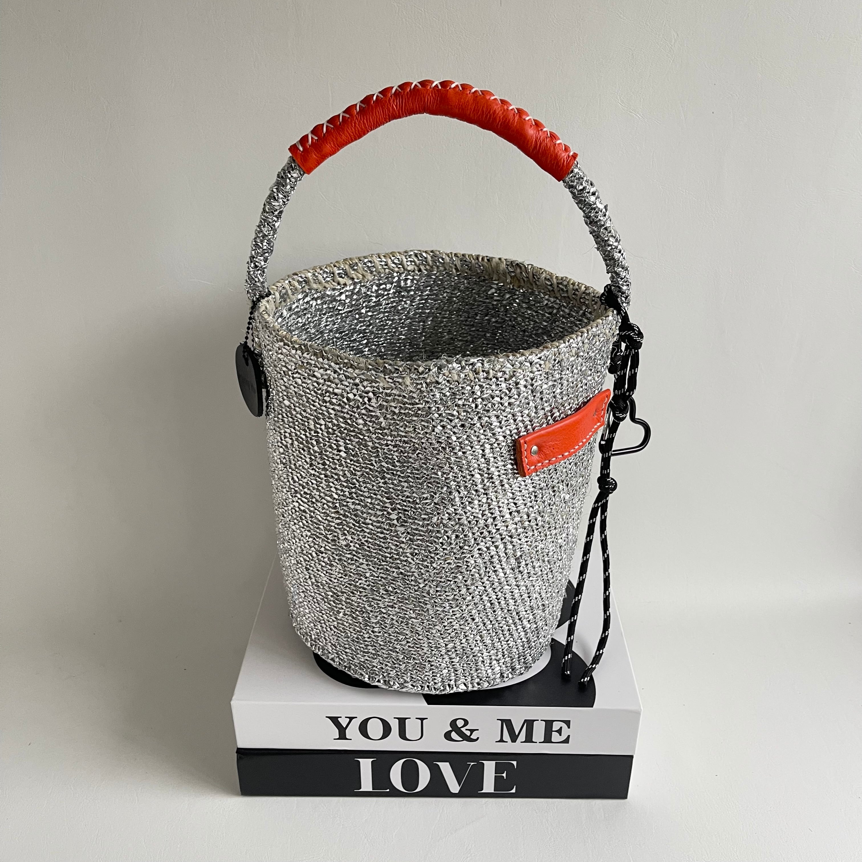環境に優しい天然素材とリサイクル素材から作られるシルバーカラーのカゴバッグ。
